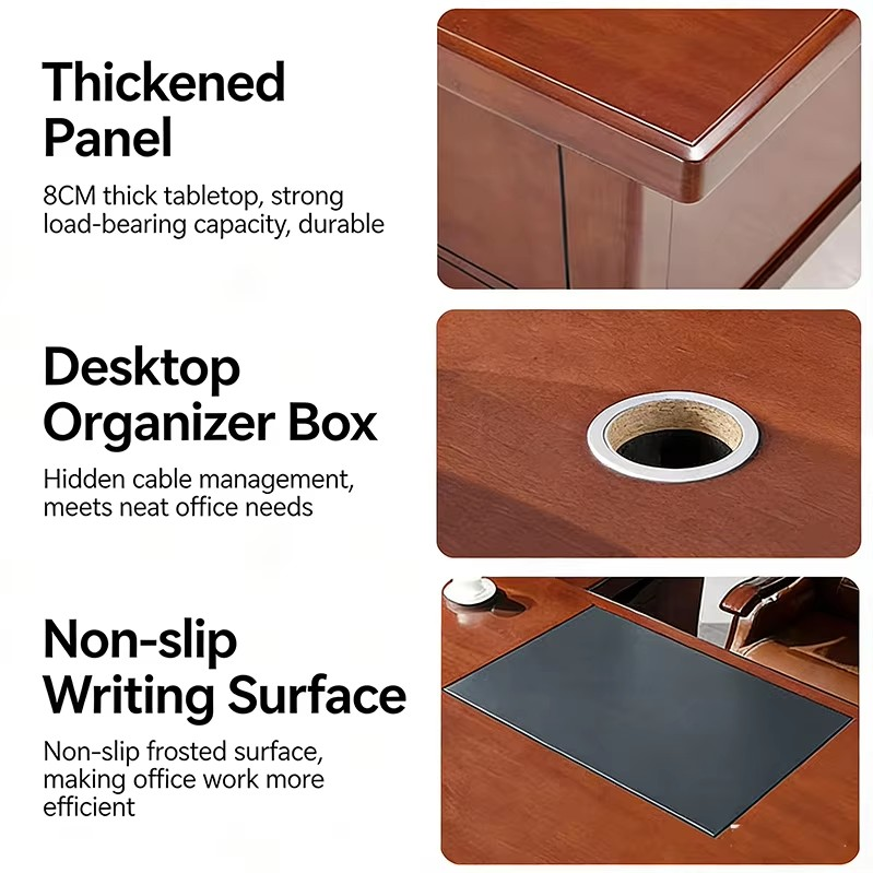The 1.8-meter wide desktop provides abundant space for laptops, monitors, printers, files, and décor items. It allows you to stay organized and work comfortably without clutter, ideal for demanding executive tasks and meetings.