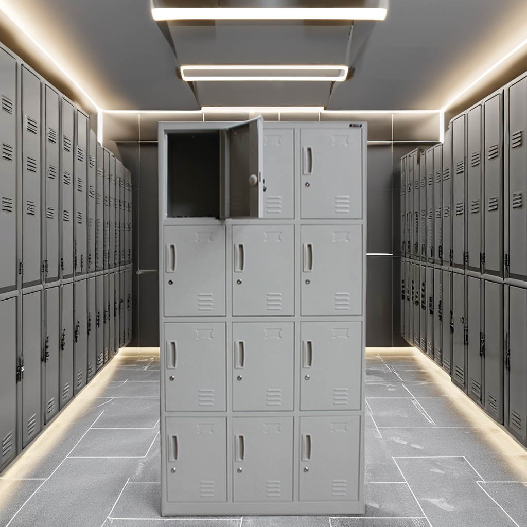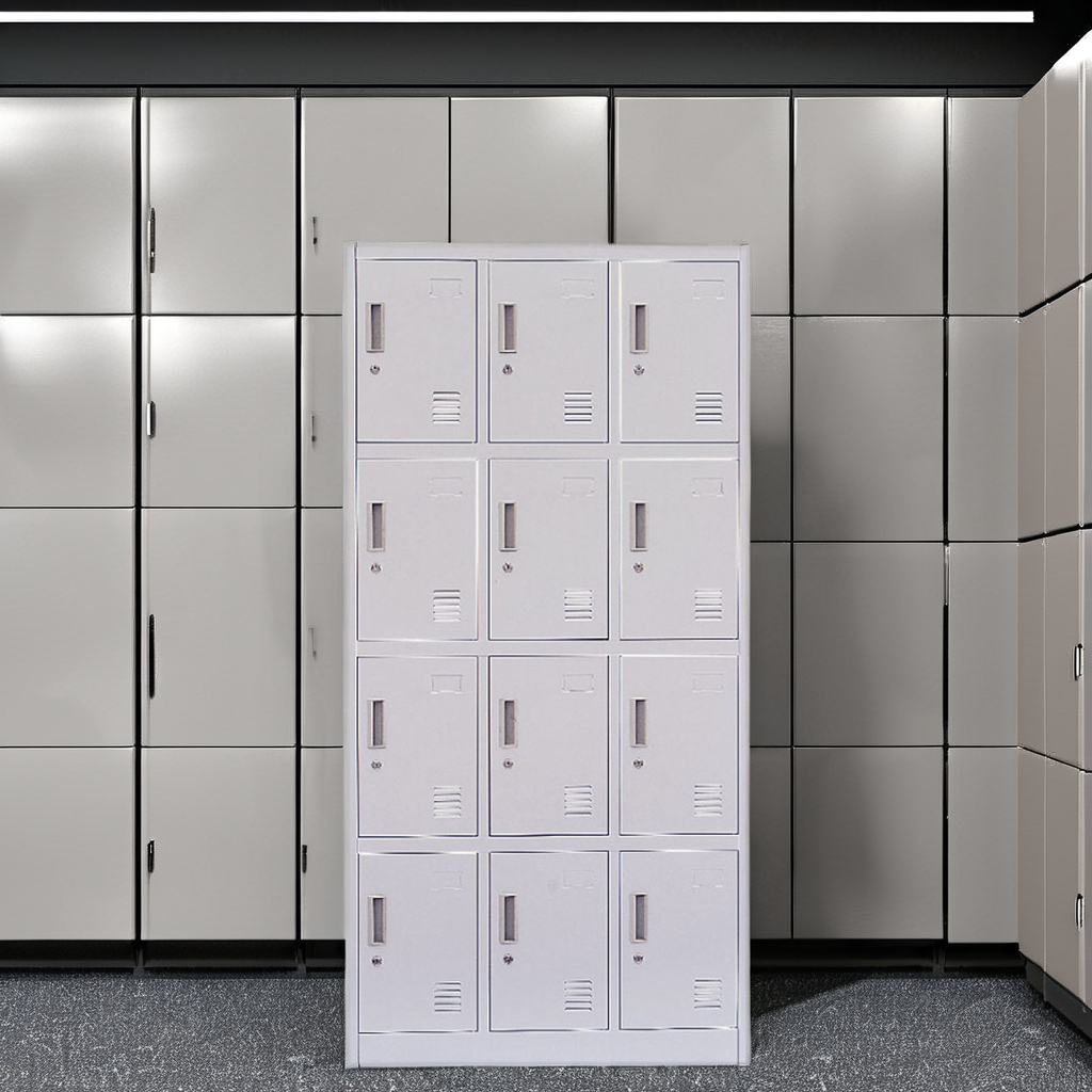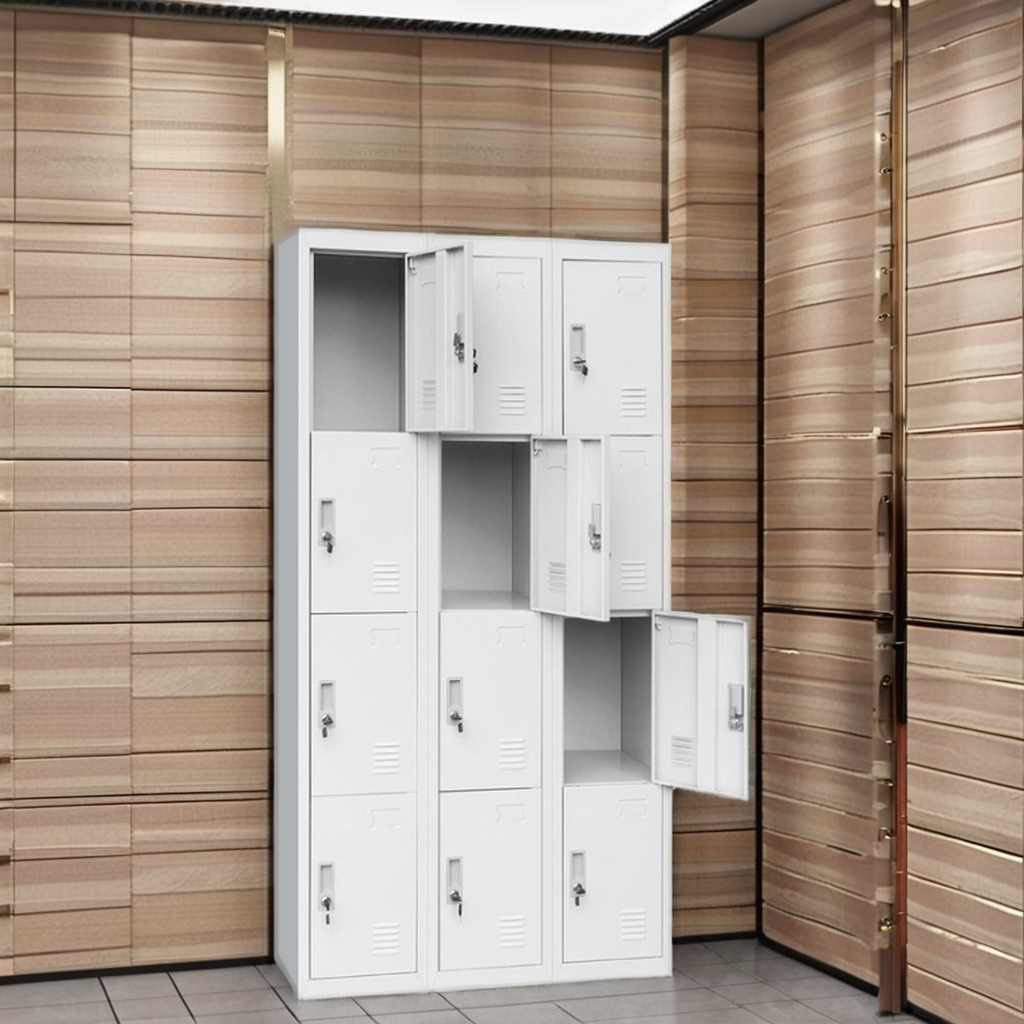 The cabinet features twelve separate lockers, each with its own secure locking system. This design allows multiple users to safely store their personal items, documents, or work materials without interference.