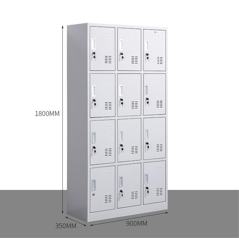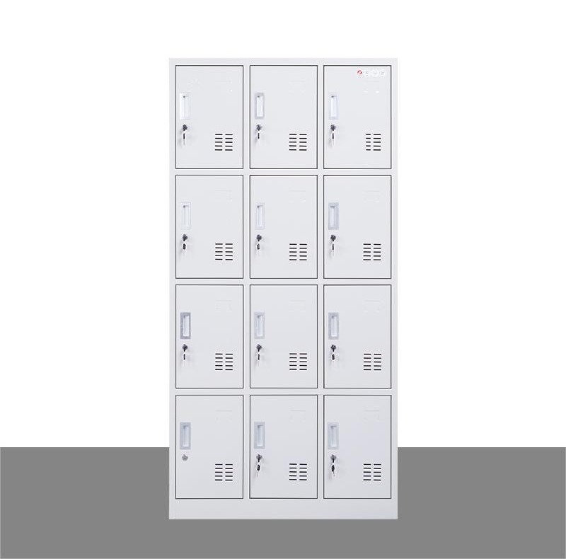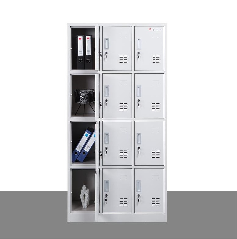 This cabinet features 12 separate lockers, each with its own locking mechanism.
