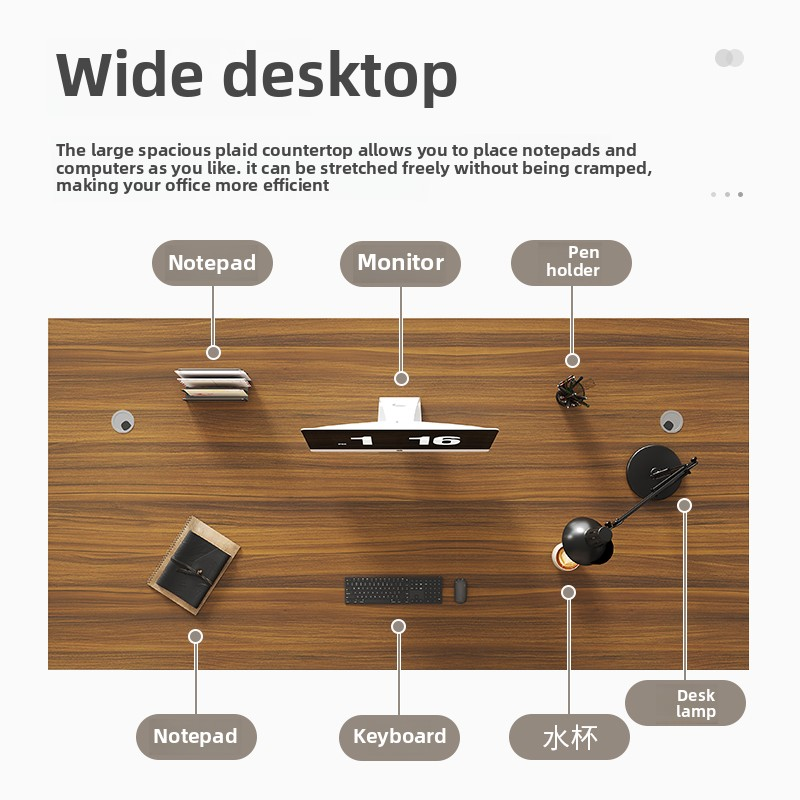 A thoughtfully sized desktop that offers ample space for laptops, monitors, paperwork, and office essentials—perfect for focused work without crowding your office.