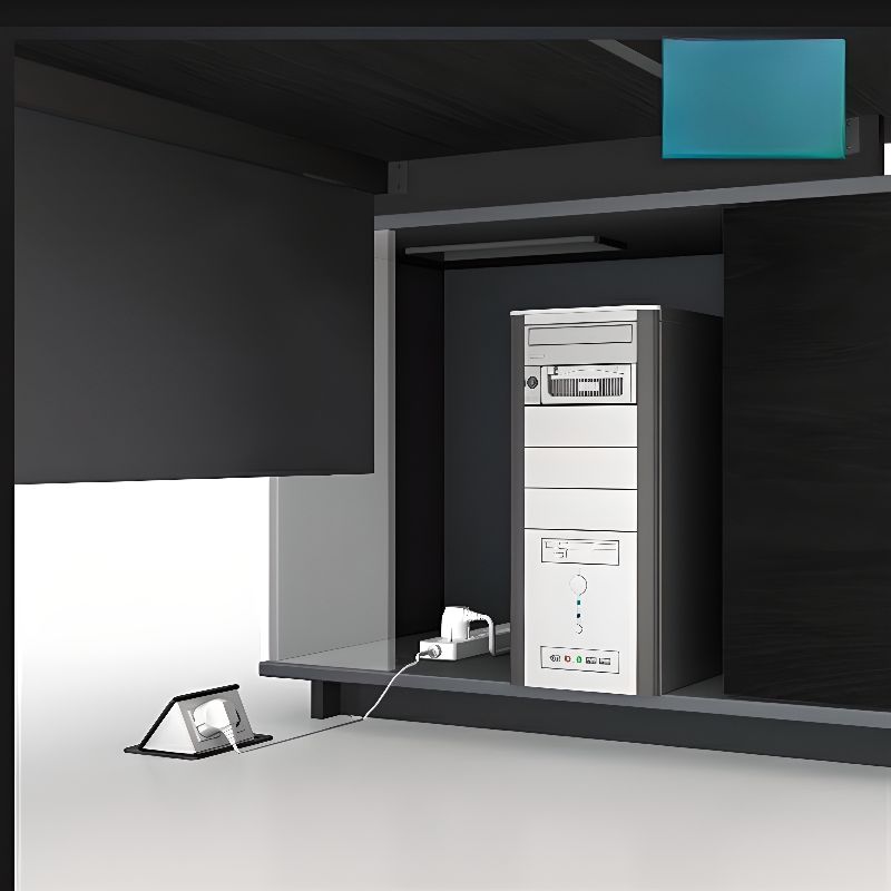 - Practical features such as cable management solutions or storage drawers