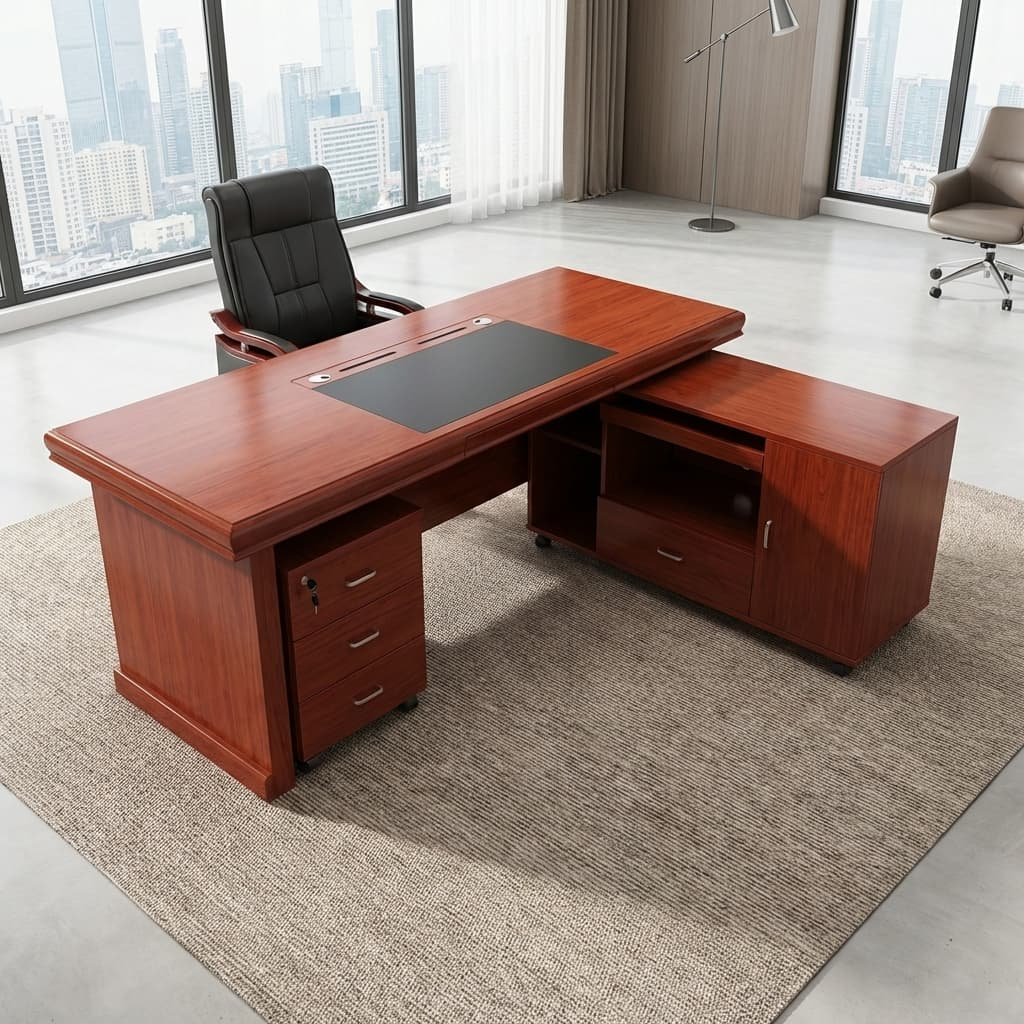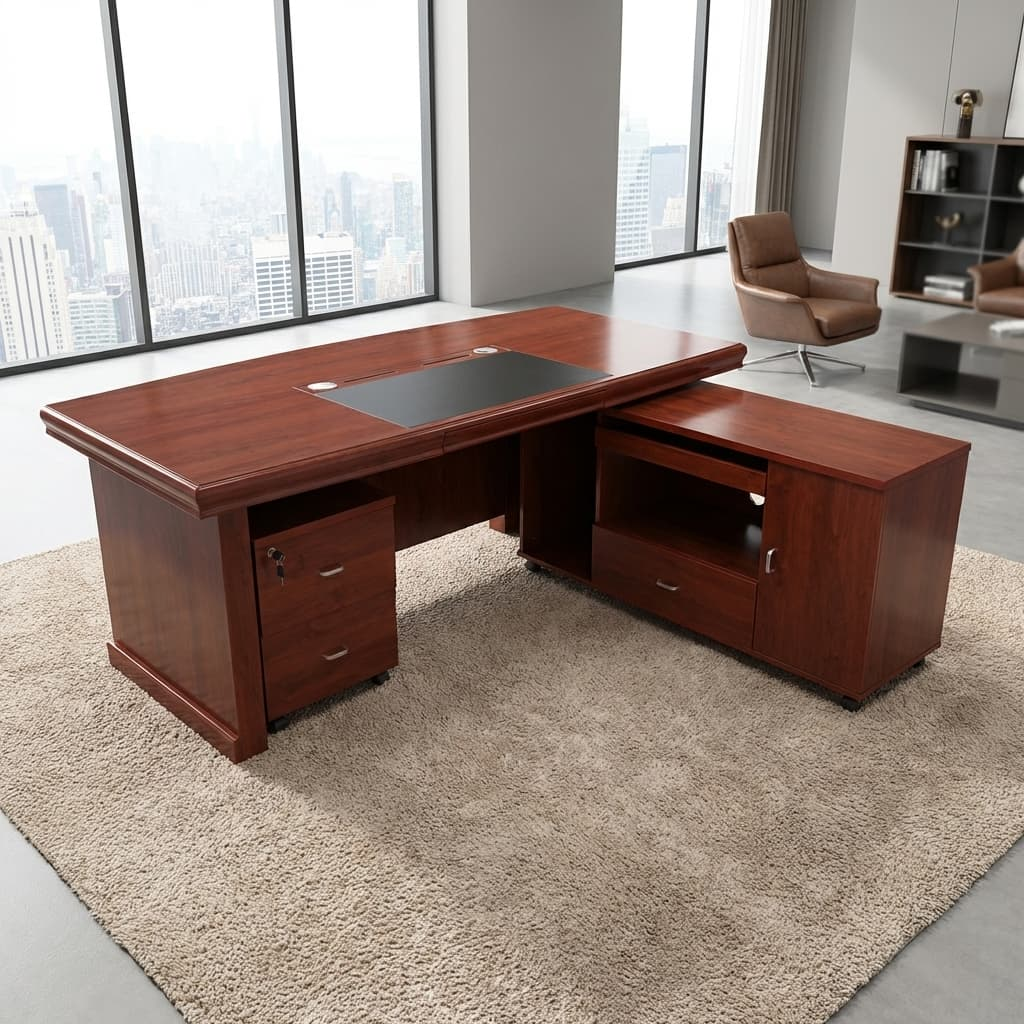 Crafted from high-quality mahogany wood or veneer, this desk features a deep, rich tone that exudes luxury and professionalism. Mahogany is widely valued for its durability and timeless appeal, making it a preferred material for executive furniture.