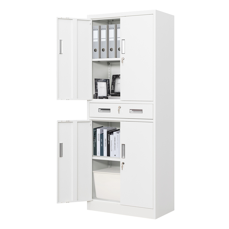 The cabinet features four large compartments behind secure doors, providing plenty of space to store files, documents, office supplies, and personal items. Keep everything neatly arranged and easily accessible.