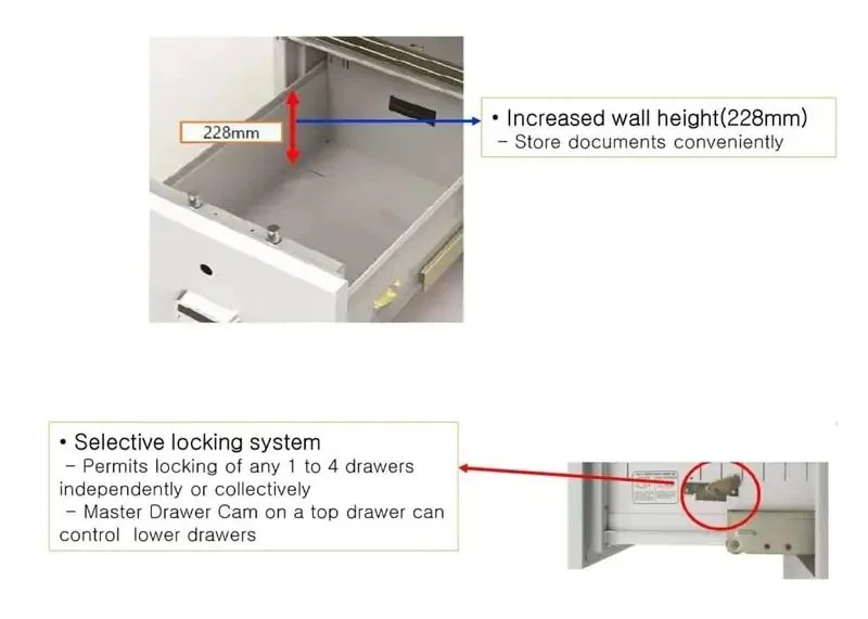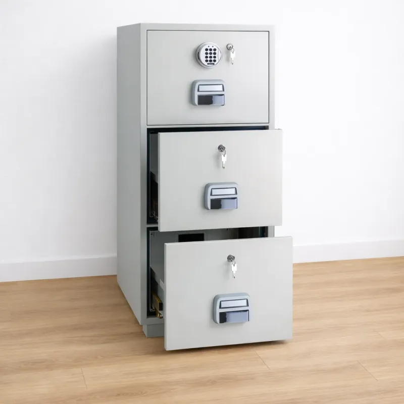 The 4-drawer vertical design accommodates A4, letter, or legal-size documents (model dependent). Each drawer glides smoothly for easy access while maintaining maximum internal protection.