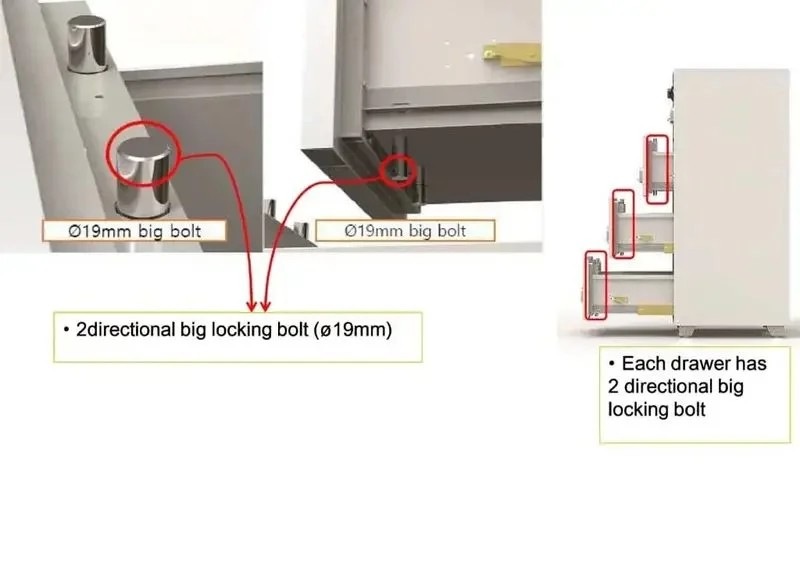 Central locking mechanism ensures all drawers remain securely closed and protected.