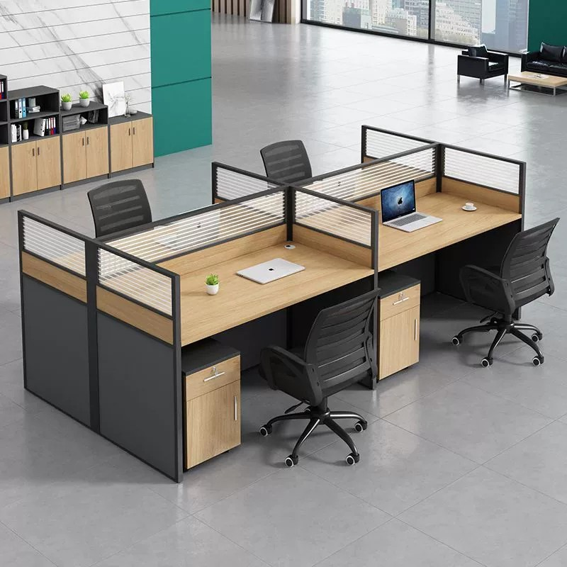 Divided into four individual workstations with partition panels for privacy and focus, promoting both teamwork and independent productivity.