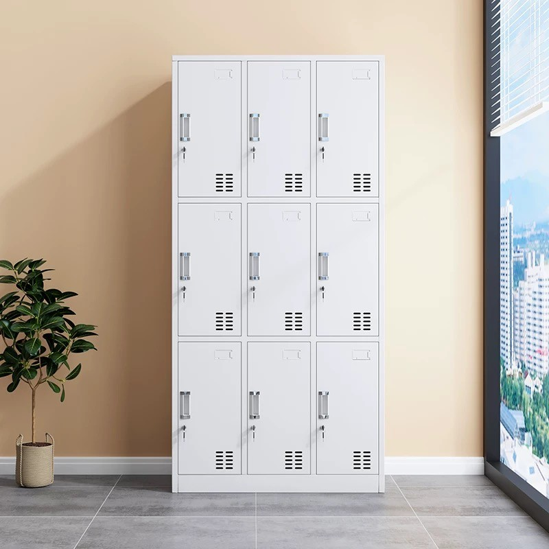 The cabinet features 9 individual lockers, each offering ample space for files, personal items, or office equipment. The multi-compartment layout allows for organized storage, making it easy to separate items for different users or purposes.