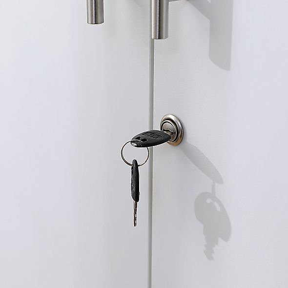 - Two-door design with locking mechanism for secure storage
