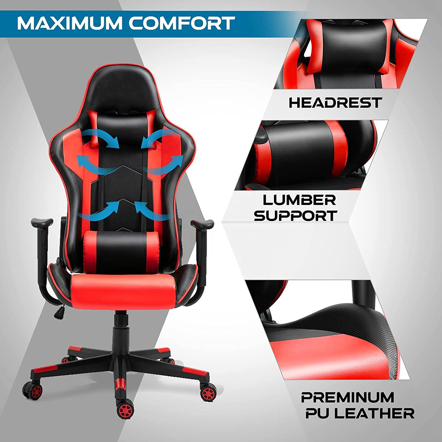 Gas lift and reclining mechanism allow customized seating angles for gaming or relaxation.
