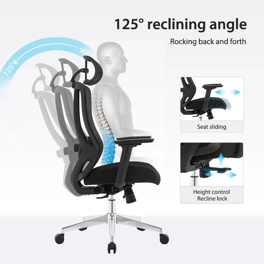The chair includes height adjustment, tilt and recline mechanisms, and supportive armrests, allowing users to customize their seating position. These adjustable features help improve comfort, reduce strain, and enhance productivity throughout the day.