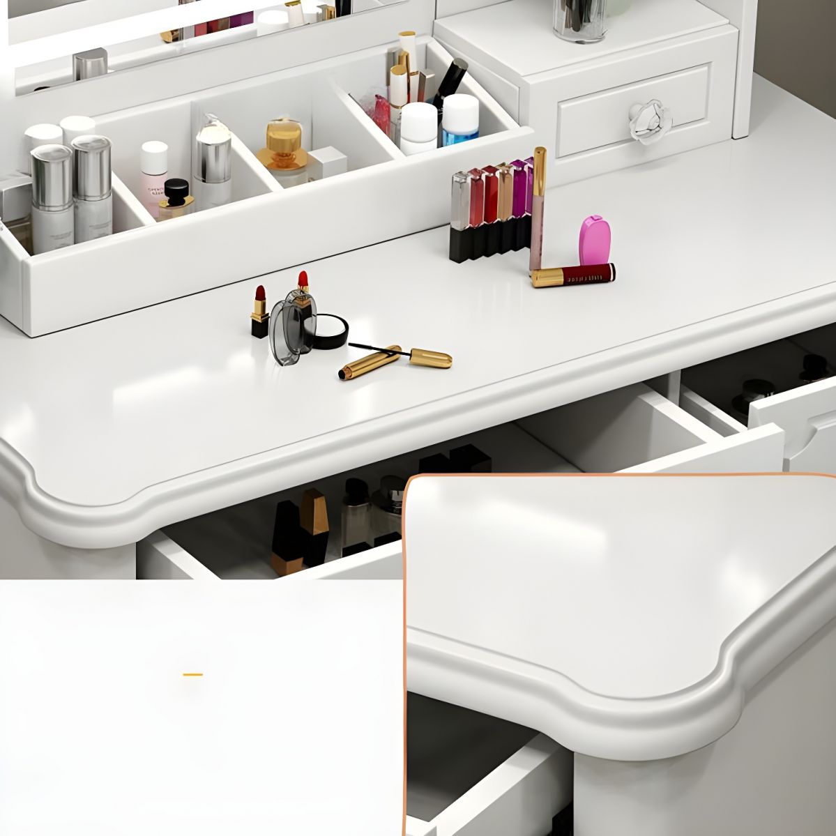 Tired of cluttered countertops? This dressing table includes multiple drawers and compartments that keep your cosmetics, jewelry, and skincare items organized and within reach.