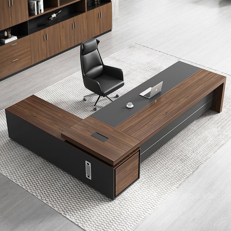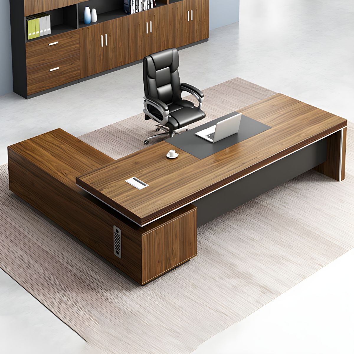 The contemporary L-shaped silhouette and refined finishes make this desk a standout piece in any workspace.