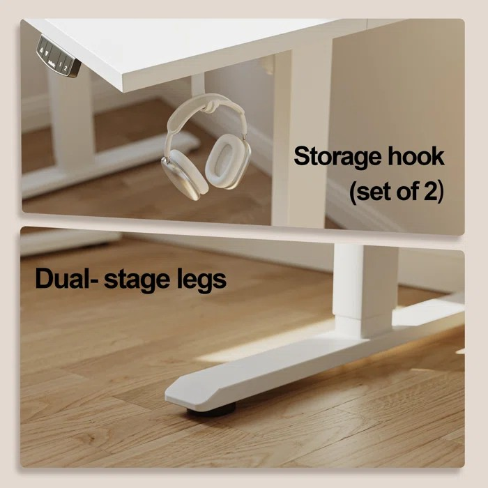 Constructed with a powder-coated steel frame, the desk supports up to 100–125 kg (220–275 lbs) of weight evenly. The T- or C-frame design ensures excellent balance and stability, even at maximum height.