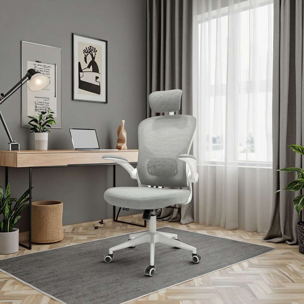 The chair features a supportive high-back design that follows the natural curve of the spine. It provides excellent lumbar, shoulder, and neck support, helping maintain proper posture and reducing strain during long work sessions.